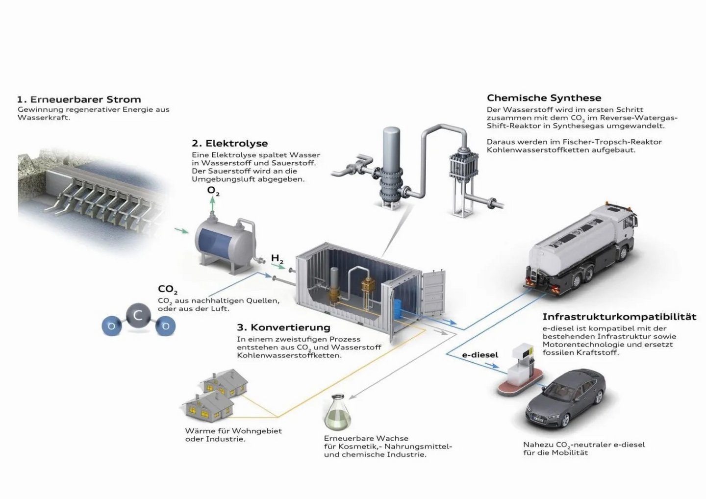 Sinnvolle Ergänzung. Da der deutsche Wirtschaftsminister eine Anschubfinanzierung von 8,32 Millionen Euro zur Verfügung stellt, dürfte das Projekt nicht nur als Versuchsballon gelten. Oliver Blume, CEO von Porsche: „E-Fuels für Automobile sind eine sinnvolle Ergänzung – wenn sie an Orten auf der Welt produziert werden, wo nachhaltige Energie im Überschuss vorhanden ist. Mit der Beteiligung an der weltweit ersten kommerziellen integrierten E-Fuel-Anlage unterstützen wir die Entwicklung von alternativen Kraftstoffen der Zukunft.“