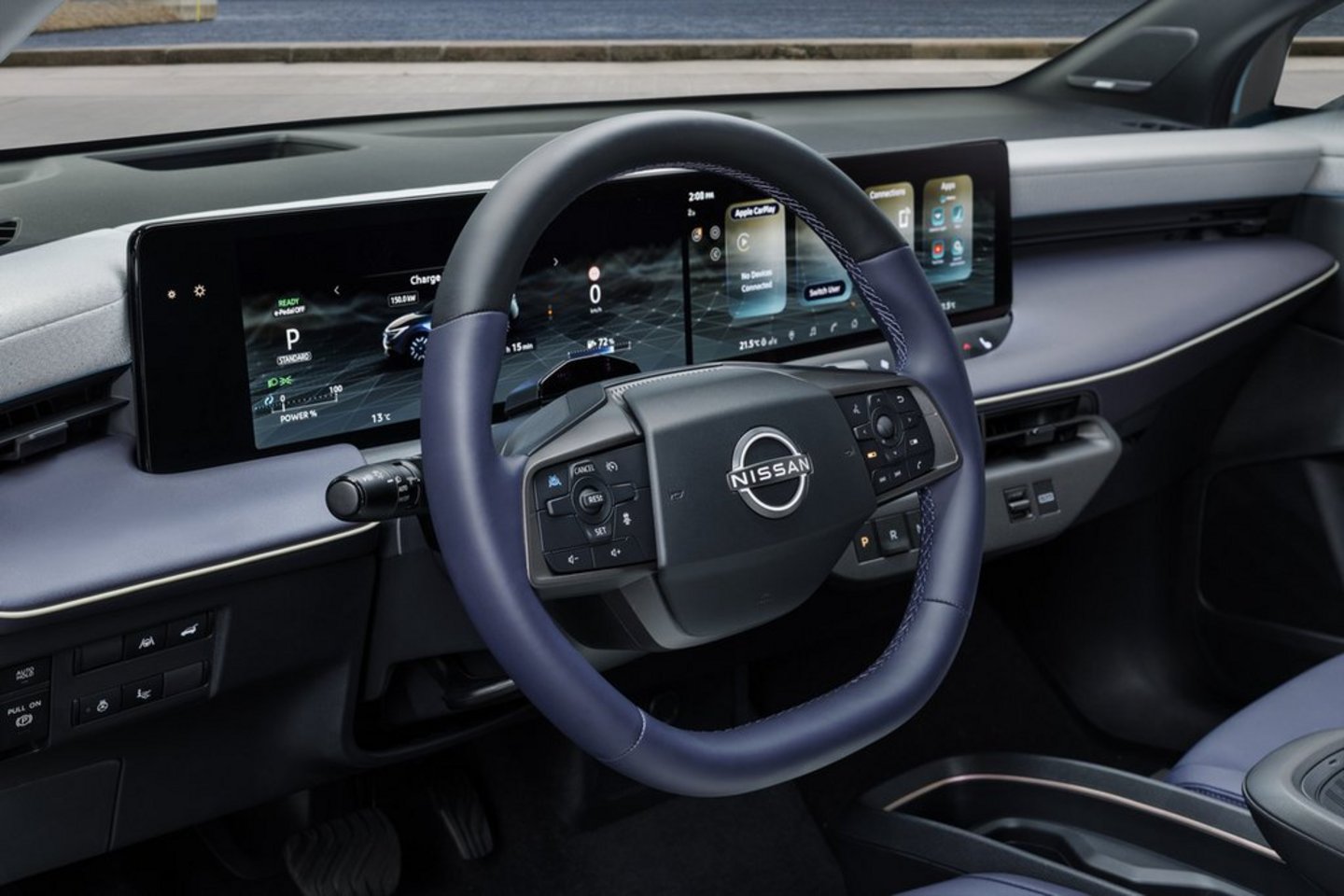 Der aufgeräumte Arbeitsplatz mit den beiden 14,3-Zoll-Displays wirkt klar und stimmig und auch die Bedienung gefällt. Unter dem Mittelscreen und am Lenkrad finden sich echte Tasten, wobei die rechte Bedienwalze am Lenkrad ergonomisch schräg angeordnet ist, der natürlichen Bewegungsrichtung des Daumens entsprechend.
