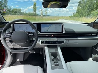 Innen offeriert der Sechser dazu passend ein großzügiges Raumgefühl und viel Platz für die Beine im Fond, etwas knapper wird es jedoch hinten mit der Kopffreiheit. Das Cockpit präsentiert sich – ähnlich wie beim Ioniq 5 – klar undglattflächig. Unter dem mittigen TouchDisplay finden sich auch echte Tasten für Heizung/Klima und Audio-Lautstärke. Gewöhnungsbedürftig sind beim Spurwechsel allerdings die optionalen Digital-Außenspiegel.