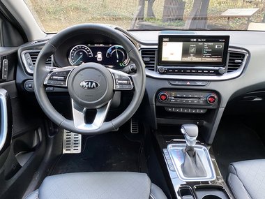Beim Fahren merkt man von der Technik erfreulich wenig. Ist der Akku voll geladen, beschleunigt der Kia recht flott. Behandelt man das Gaspedal nach Zen etwas zärtlicher, schafft der Kia auch beinahe die im Prospekt versprochenen 48 Kilometer an elektrischer Reichweite - und das ohne, dass man gleich zum Verkehrshindernis wird. Bis 120 km/h sind elektrisch möglich. Fährt man den Akku jedoch leer - was uns wegen einer renitenten Ladesäule passiert ist - wird’s zäh. Man merkt dem tapfer kämpfenden Saugmotor seine fehlende elektrische Unterstützung an, es fehlen die 45 kW und vor allem die 170 Nm der E-Maschine. Gleichzeitig mindert das absurd lang übersetzte 6-Gang-Doppelkupplungsgetriebe jegliche Agilität. Auch das ein Fall für Zen.