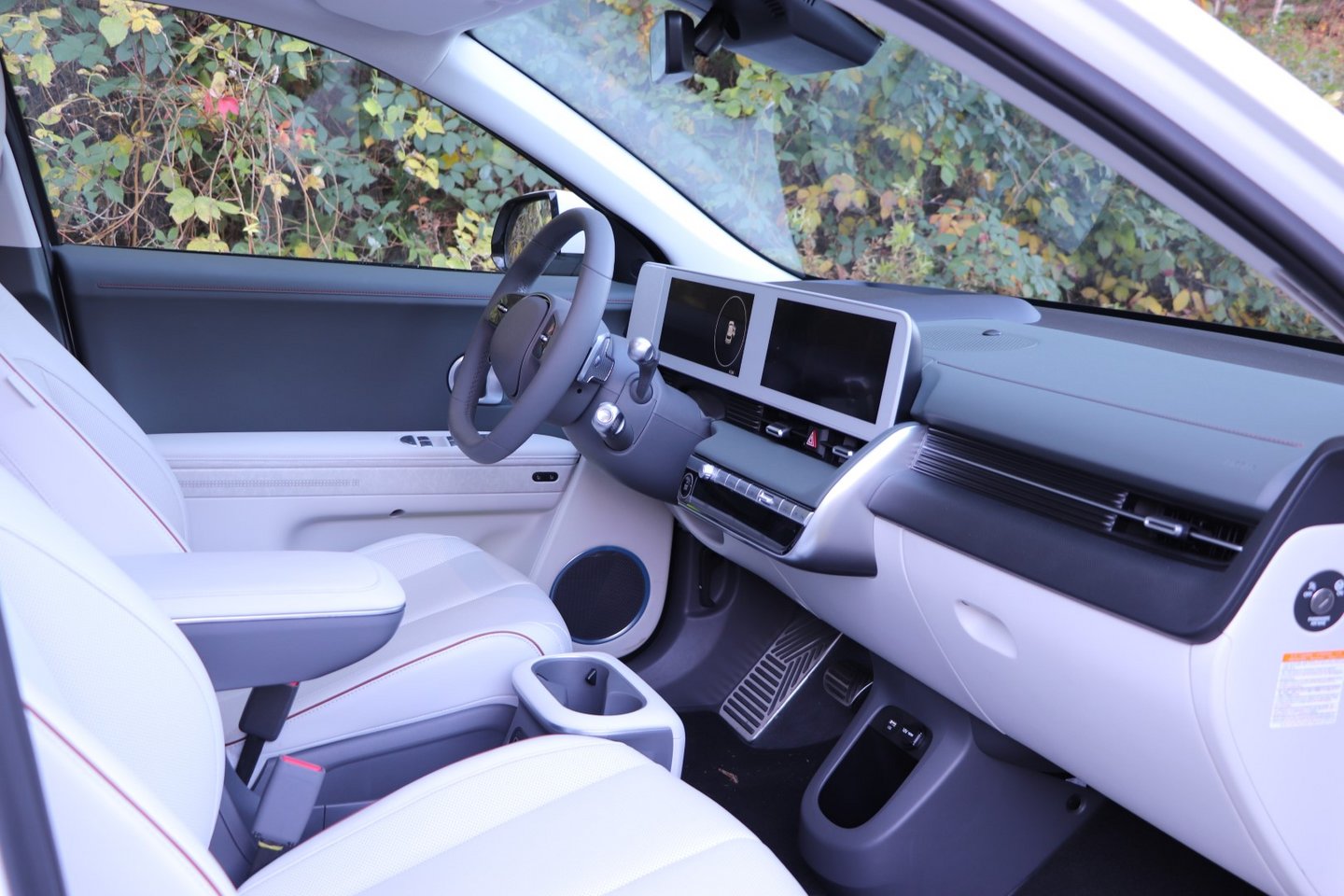 Dem futuristischen Auftritt steht auch der Innenraum in nichts nach. Der Arbeitsplatz ist zwar schlicht angerichtet, das Cockpit ist aber geprägt von einer auffälligen Display-Front aus zwei Bildschirmen. Auffällig sind auch die großzügigen Platzverhältnisse. Bei drei Meter Radstand bietet der Ioniq 5 auch in Reihe zwei üppig Platz und man genießt auf allen Plätzen Business-Class-Feeling.